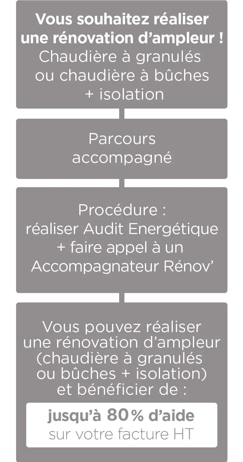 Vous envisagez une rénovation d’ampleur pour votre logement, incluant l'installation d'une chaudière à granulés de bois ou d’une chaudière bûches ainsi que l'isolation de tout ou partie de votre maison ?